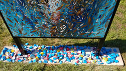 Desription de l'activitét:Les pierres furent préparées au préalable par Mme Laurin et peintes d'une couleur vive et unie, s’agençant au panneau principal de l'œuvre. La population fut ensuite invitée à créer des insectes, des animaux, des fruits etc. en surcouche, puis à les déposer au pied de la structure pour recouvrir la dalle de béton qui l'encre au sol. Les participants furent guidés par les quatre (4) Voisines durant la médiation, ce qui a permis un résultat des plus concluant, complétant l'œuvre à merveille et augmentant ainsi le sentiment d'appartenance.